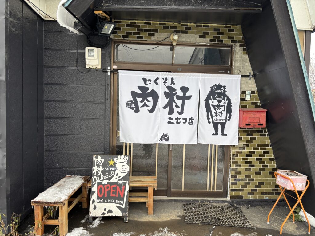 〈肉村〉ニセコ店の外観。オリジナリティのあるのれんが目印